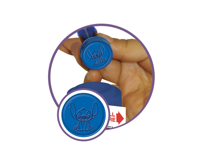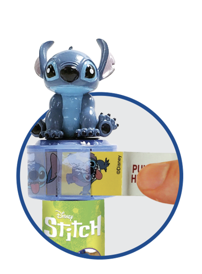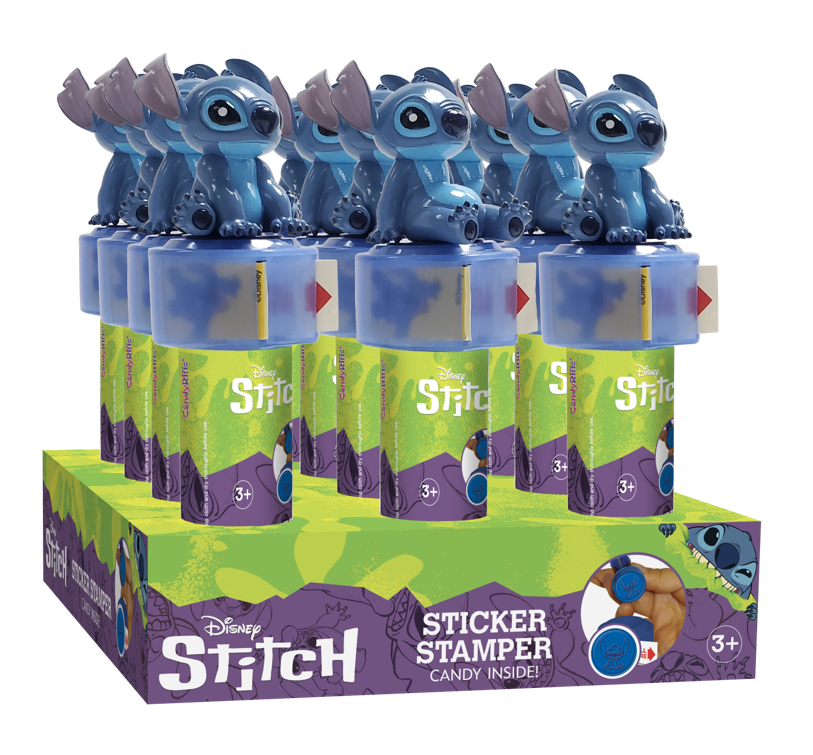 *Disney Stitch Sticker Stamper. A fun, Stitched-themed handheld activity set that includes a character stamper and roll of stickers. Character Topper comes off and has a pre-inked character art stamper underneath. Stickers are loaded in base below character stamper which can easily be dispensed by pulling roll in direction of arrow. Each Stamper comes with a 0.53oz packet of dextrose candy inside.