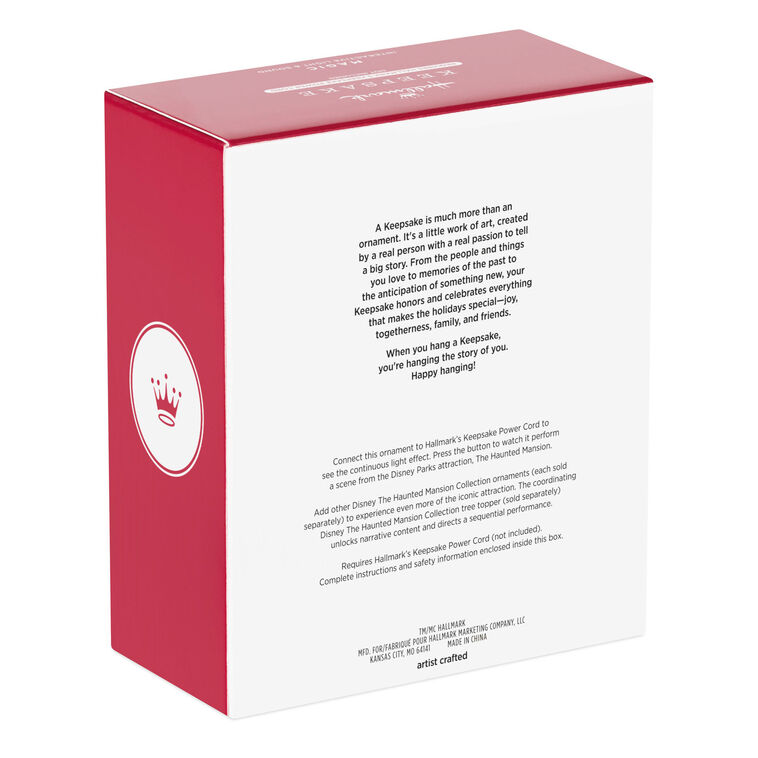 Relive the fun of a visit to the Disney Parks right on your Christmas tree! Your tour of The Haunted Mansion comes to a close with this Christmas tree ornament featuring the beloved Hitchhiking Ghosts. But beware as you pass the crypt on your journey back to the land of foolish mortals; a ghost might just follow you home. Plug the ornament into Hallmark's Keepsake Power Cord (sold separately) for constant illumination, then press the button to start a sound and light show scene. Connect all of The Haunted Mansion Collection ornaments—Madame Leota, Victor Geist, The Coffin in the Conservatory, Constance Hatchaway, The Caretaker and His Dog, The Singing Busts, The Opera Singers and The Hitchhiking Ghosts—and The Haunted Mansion Tree Topper (each sold separately) to unlock additional amazingly interactive performances. We think you'll agree these happy haunts deserve a place in the dead center of your holiday decor.