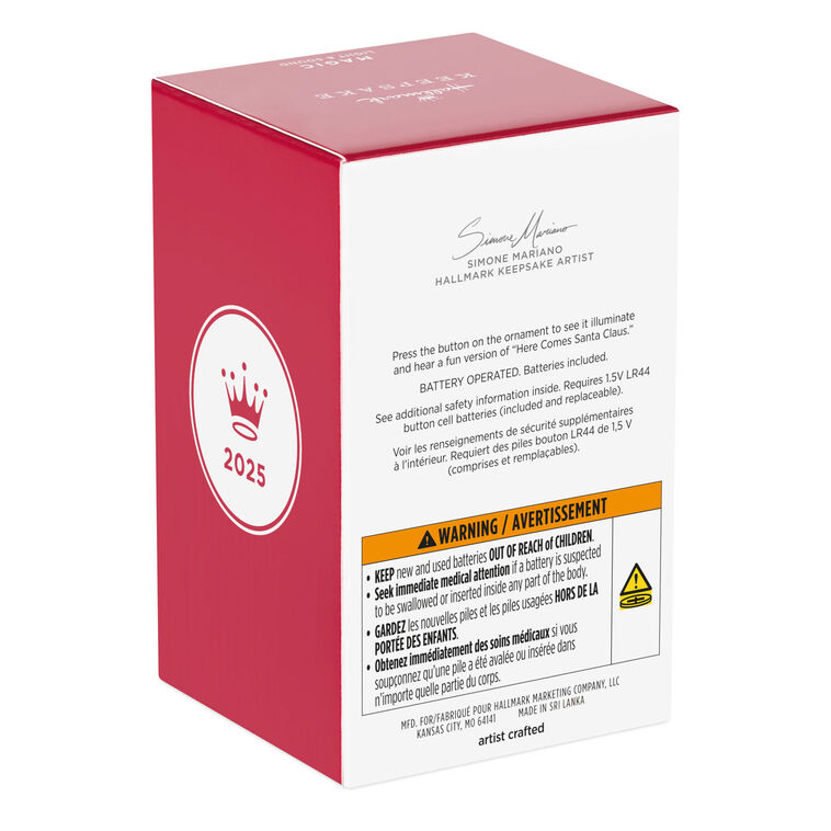 Make the holiday season out of sight with this awesome Christmas tree ornament! Santa gives a friendly wave out the window as the cool dude and his groovy elves cruise in a vintage van topped with presents to deliver to all the far out girls and boys. Press the button to see the decoration light up and hear a beachy version of "Here Comes Santa Claus." Battery operated.