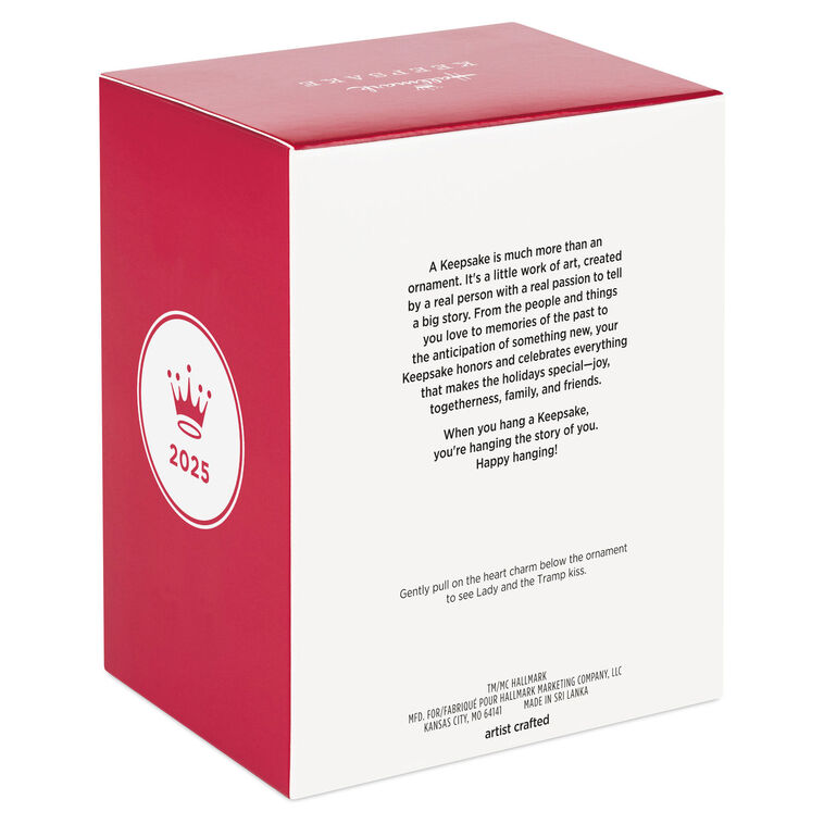 This demure Cocker Spaniel and sociable stray are proof that opposites attract and love truly does stand the test of time! Raise a glass—or a spaghetti noodle—to the 70th anniversary of the iconic animated Disney film "Lady and the Tramp" as you display this darling Christmas tree ornament featuring the seemingly unlikely canine couple who melt hearts year after year.