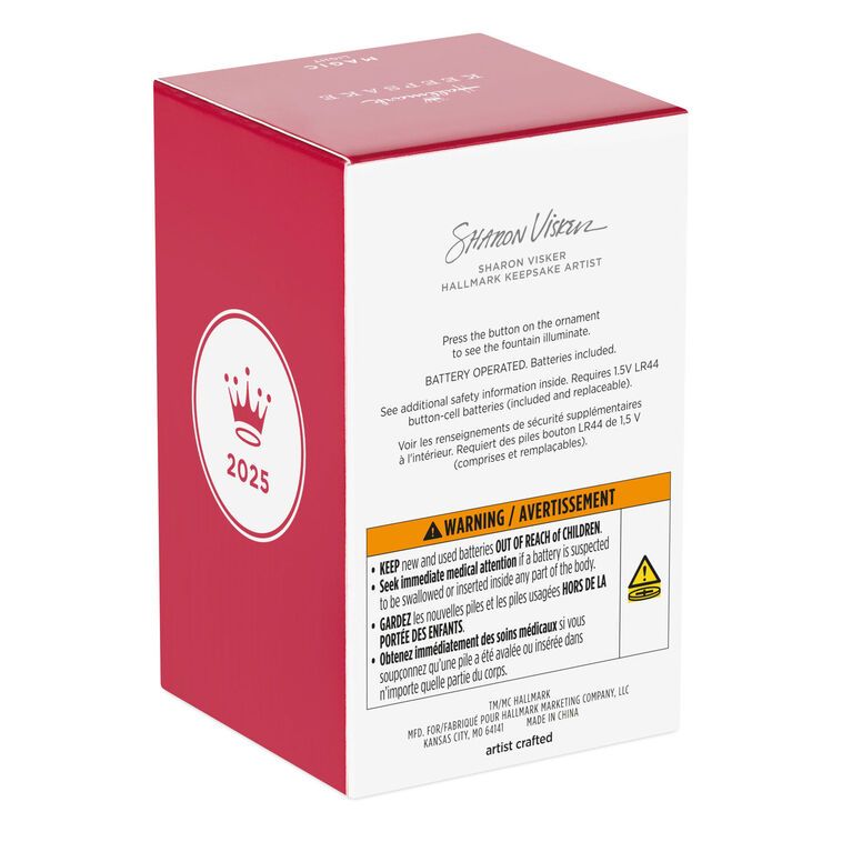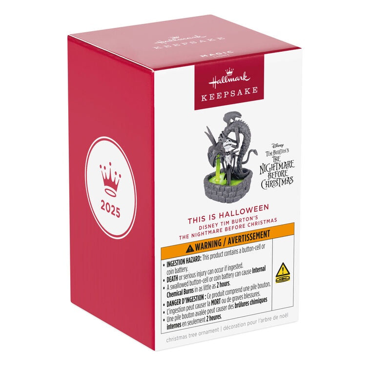 All hail The Pumpkin King! This Christmas tree ornament features Jack Skellington standing in the iconic Halloween Town fountain, which boasts a dragon-like ghoul. Press the button on the base to see the eerie scene glow green, a fun and festive homage to Disney Tim Burton's “The Nightmare Before Christmas.” Battery operated.