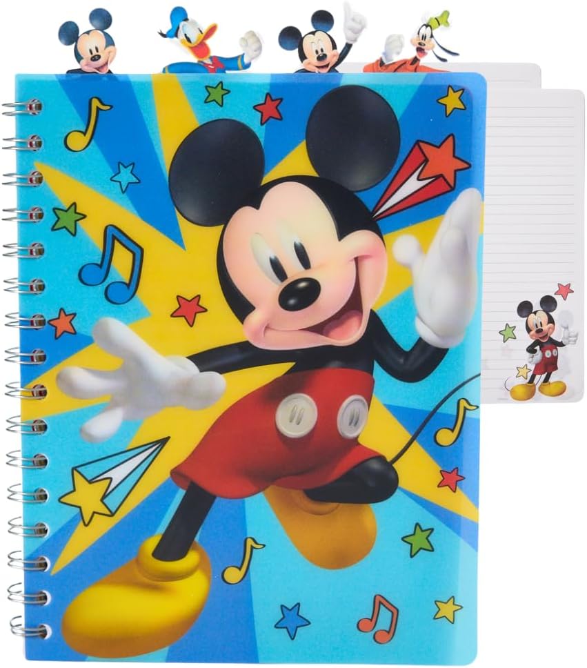 SPIRAL NOTEBOOK SET – this cute stationery set features notebook with Mickey Mouse on the front cover, lined pages with color images of Mickey and friends on the corners, 4 color illustrated section dividers, tab dividers,