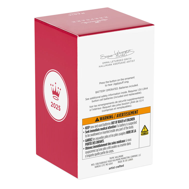 Give a Pokémon fan a reason to smile with this sweet Christmas tree ornament of Jigglypuff, the pink, round Pokémon beloved by trainers and known for its lovely singing. Press the button on the base of the ornament to hear the character from the Pokémon animated series sing into a green-tipped microphone. Battery operated
