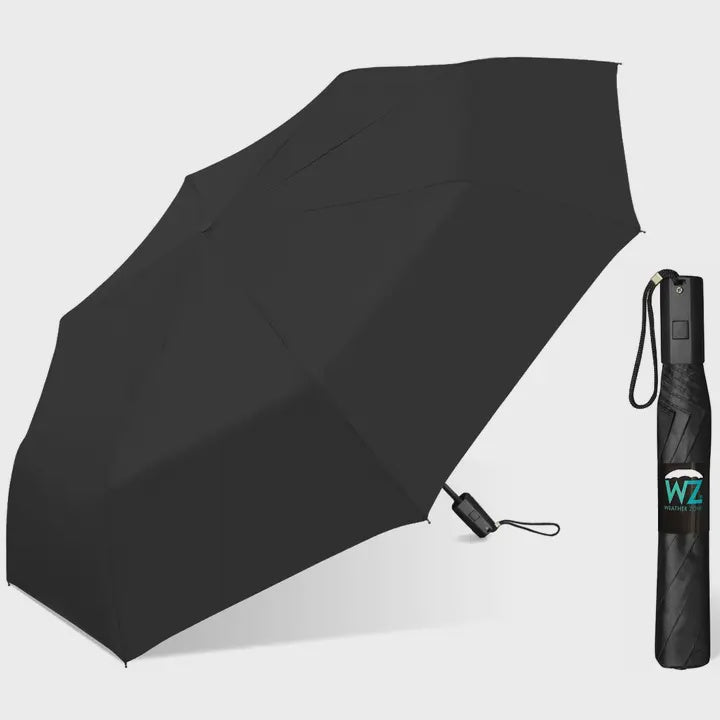This Weather Zone automatic open umbrella is a handsome black collapsible rain umbrella (or sun umbrella) designed with a waterproof cover material to keep you dry on any rainy day. When opened, the metal frame creates a 37-inch arc. The handle features color matching technology. It is perfect to keep dry during Spring Showers while walking through your garden. Umbrellas can be a great fit in many types of stores, businesses, or travel centers. This includes a Boutique, Gift Store, Clothing Store, Beach Shop, Consignment, Hotel, and more. It can be displayed in an impulse area or along with clothing accessories. • Arc: 37" • Length: 14.25" • Diameter: 32" • Automatic Open • Folding Frame • Style: Folding • Size: One Person • Color: Solid Black • Fabric Material: Polyester • Panels: 8 • Ribs: Metal • Shaft: Metal • Frame: Metal • Color Matching PP Handle